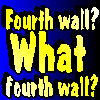 Description: Yellow text on a blue background that reads 'fourth wall? what fourth wall?'